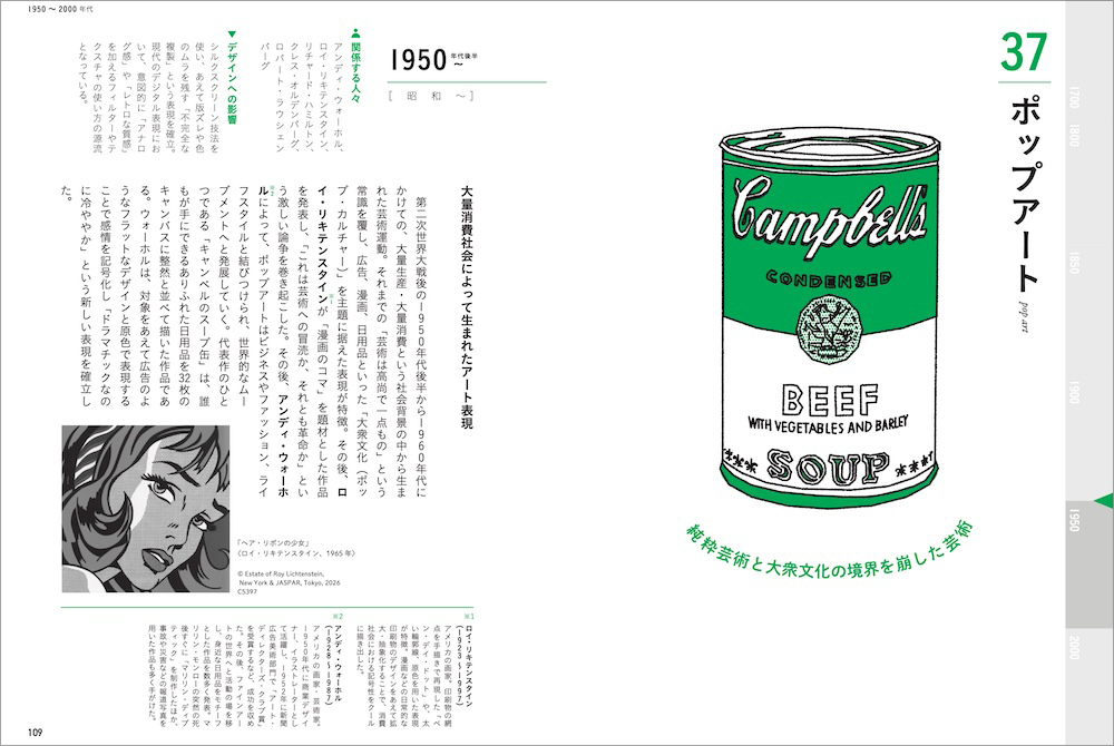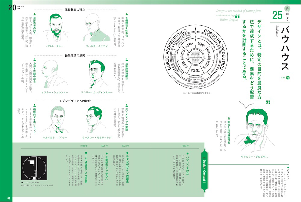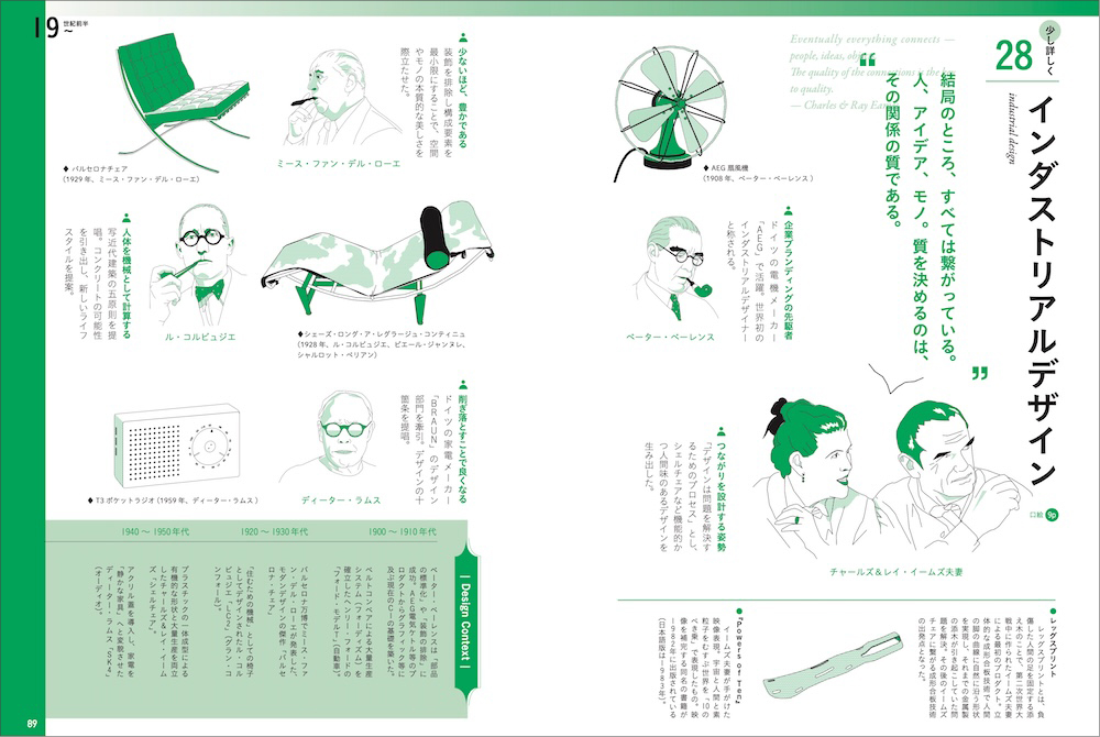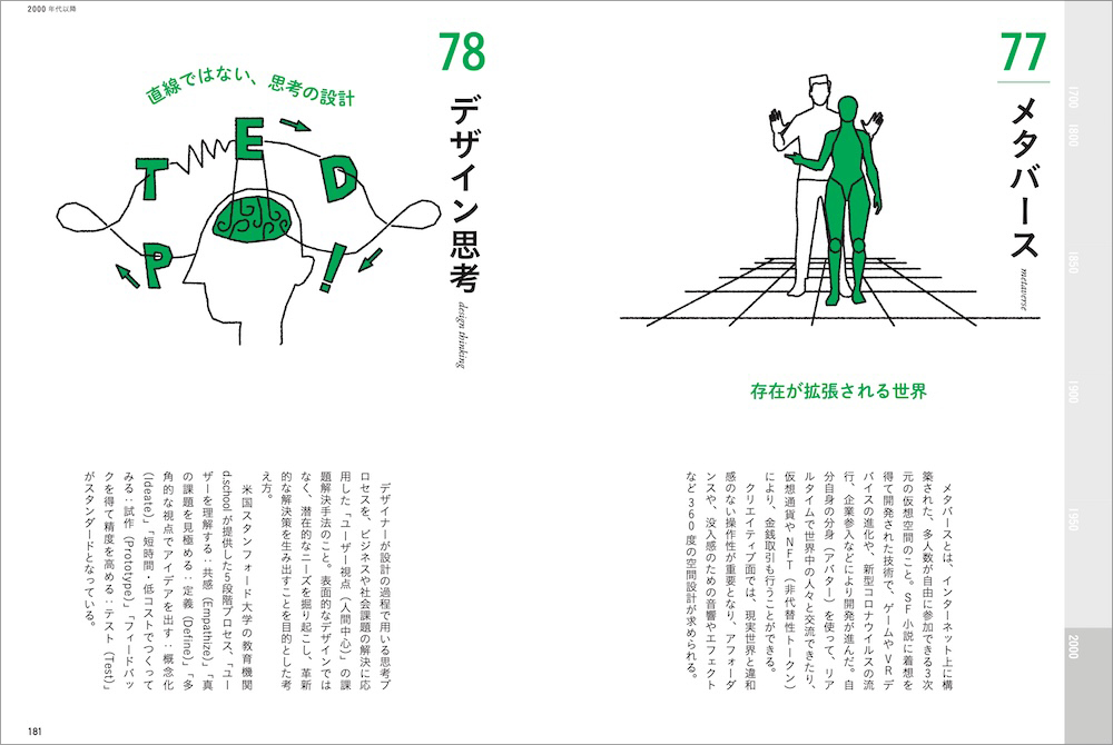 また、21世紀以降に登場したデザイン用語についても多数収録。文字面だけでは理解しづらいIT分野や抽象的な概念についても、シンボライズしたイラストが理解の助けになります。古代から今この瞬間までのデザイン史を、広く概覧できるようになっています。